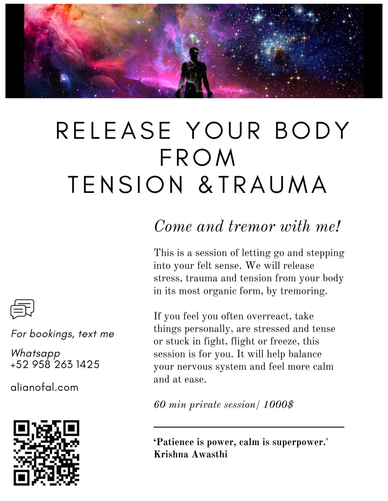 We do a series of 7 exercises that work with the muscles of the lower body and build up a little tremor in the legs. Then, lying on our backs, we encourage these natural vibrations, the trembling, to move through the body without trying to control it. We learn to become mindful of feelings and sensations and it can be a wonderful feeling of physical and emotional release for many.