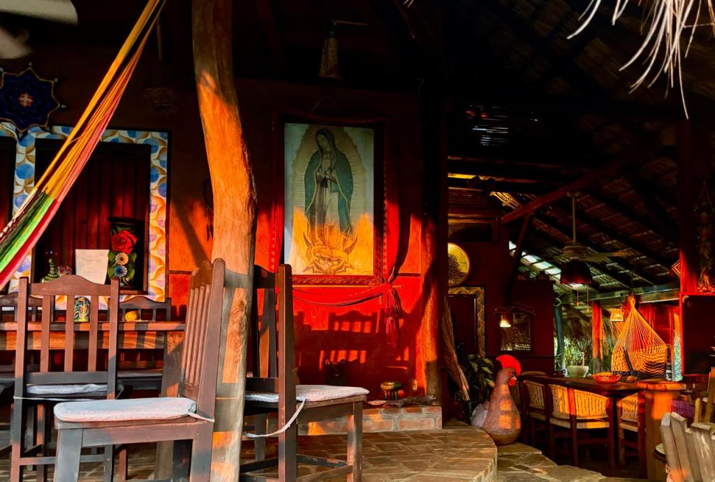 Numerosas zonas para sentarse, una chimenea, hamacas y el tranquilo entorno invitan a la relajación. La magia de este pequeño paraíso y la conexión con la naturaleza que se puede experimentar aquí, crean un refugio donde la vida y el yoga se pueden experimentar a un nivel más profundo.